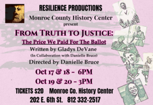 Justice: The Price We Paid for the Ballot. This original play tells the story of the contentious relationship between the Black and White suffrage movements. It provides insight into the dilemma created by the proposed ratification of the 15th Amendment. It exposes the attitudes and behaviors of two groups fighting for a common good but whose worldviews differ significantly. Sojourner Truth, Francis Harper, Susan B Anthony, Elizabeth Cady Stanton, Mary Church Terrell, and Daisy Lampkins weave the story of the tumultuous journey to access the ballot. The women of Resilience Productions are honored to be included in the Off-Night Play Reading Festival, featuring plays written by women. Resilience Indiana’s Untold Stories is the opening play, on Sunday, October 27th at 2:00 p.m. matinee at the Constellation Playhouse (located at 107 W. 9th here in Bloomington).