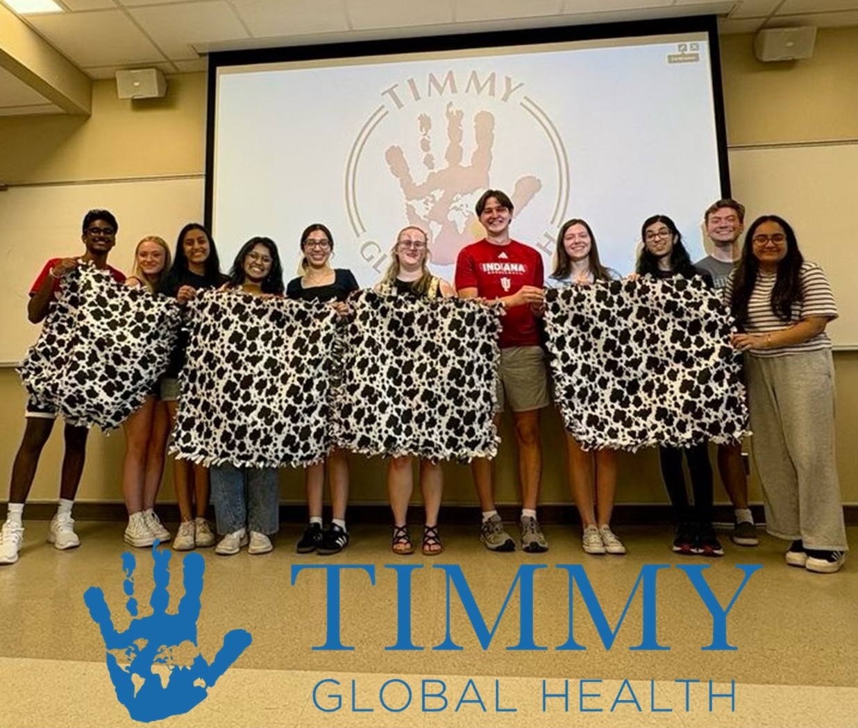 Students active in Timmy Global Health at IU show blankets they donated to Shalom Center