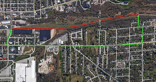 The city of Bloomington is encouraging commuters that regularly use the B-Line trail along the upcoming Switchyard Park area to instead use the sidewalks along South Rogers Street. According to a press release from the city of Bloomington, the alternate route is marked with B-Line Trail detour signs.