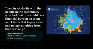Podcast: Play in new window | Download (Duration: 4:46 — 6.6MB)Subscribe: RSSA local “citizen-organized group” has undertaken a coordinated effort to mobilize residents across Monroe County to challenge their potential annexation by the City of Bloomington. WFHB met with Monroe County Residents Against Annexation member Margaret Clements who further elaborated on the function and role of such an organization. “That …