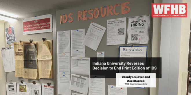 Later that month, Indiana University reversed course on the decision to cancel the print edition of the Indiana Daily Student. This followed backlash from faculty members, students, free speech groups and the national media. The print edition since the cancellation hit newsstands on November 20th. In today’s feature report, WFHB News Correspondents Camdyn Glover and Zoe Moczek speak with Mia Hilkowitz, co-editor-in-chief of the IDS, about the future of press freedom at IU.
